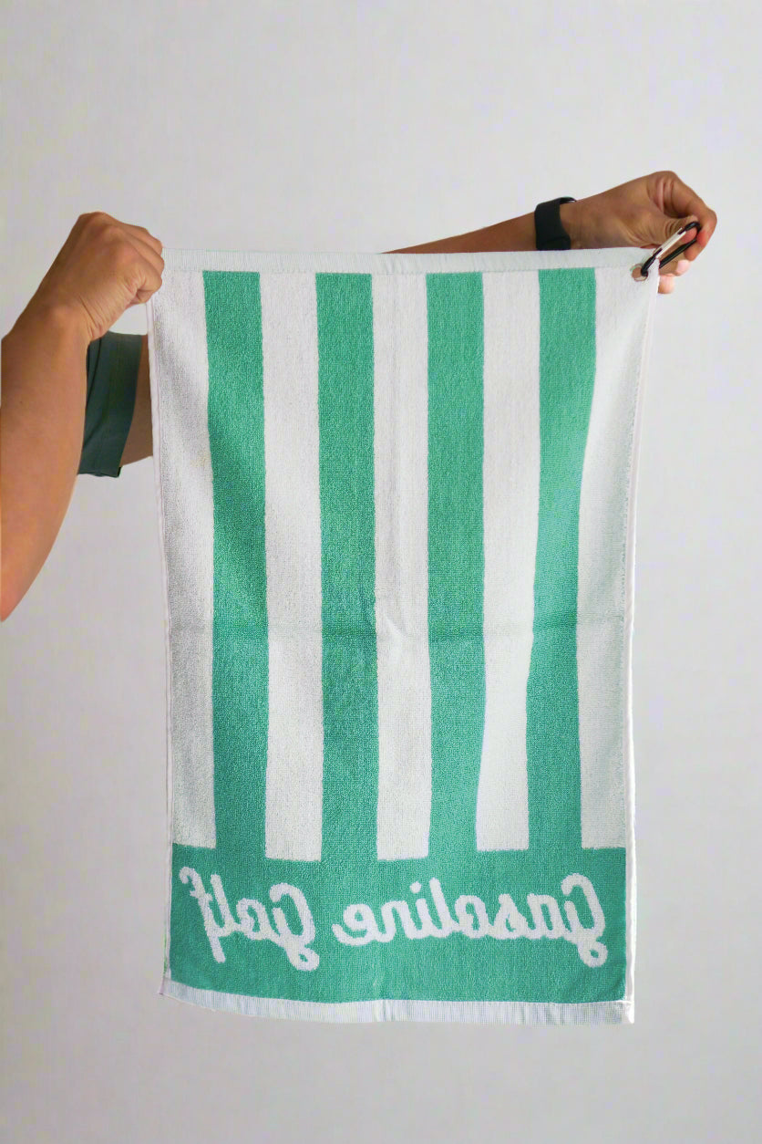 Bring the four seasons to the course with our signature premium heavy duty cotton golf towel. Featuring mint green stripes with Gasoline Golf logo threaded. This 100% cotton towel will keep your clubs and balls looking new. Each towel comes with a clip to hang from your golf bag.